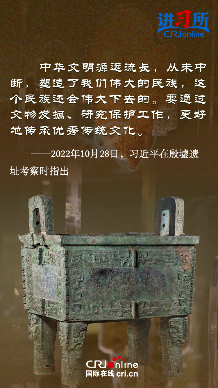文物和文化遺產(chǎn)承載燦爛文明,傳承歷史文化,維系民族精神。三星堆博物館、殷墟遺址、敦煌研究院……這些年,習近平高度重視中華文明探源工程和文物保護工作,強調要把中華文明歷史引向深入,把中華優(yōu)秀傳統(tǒng)文化一代一代傳下去。