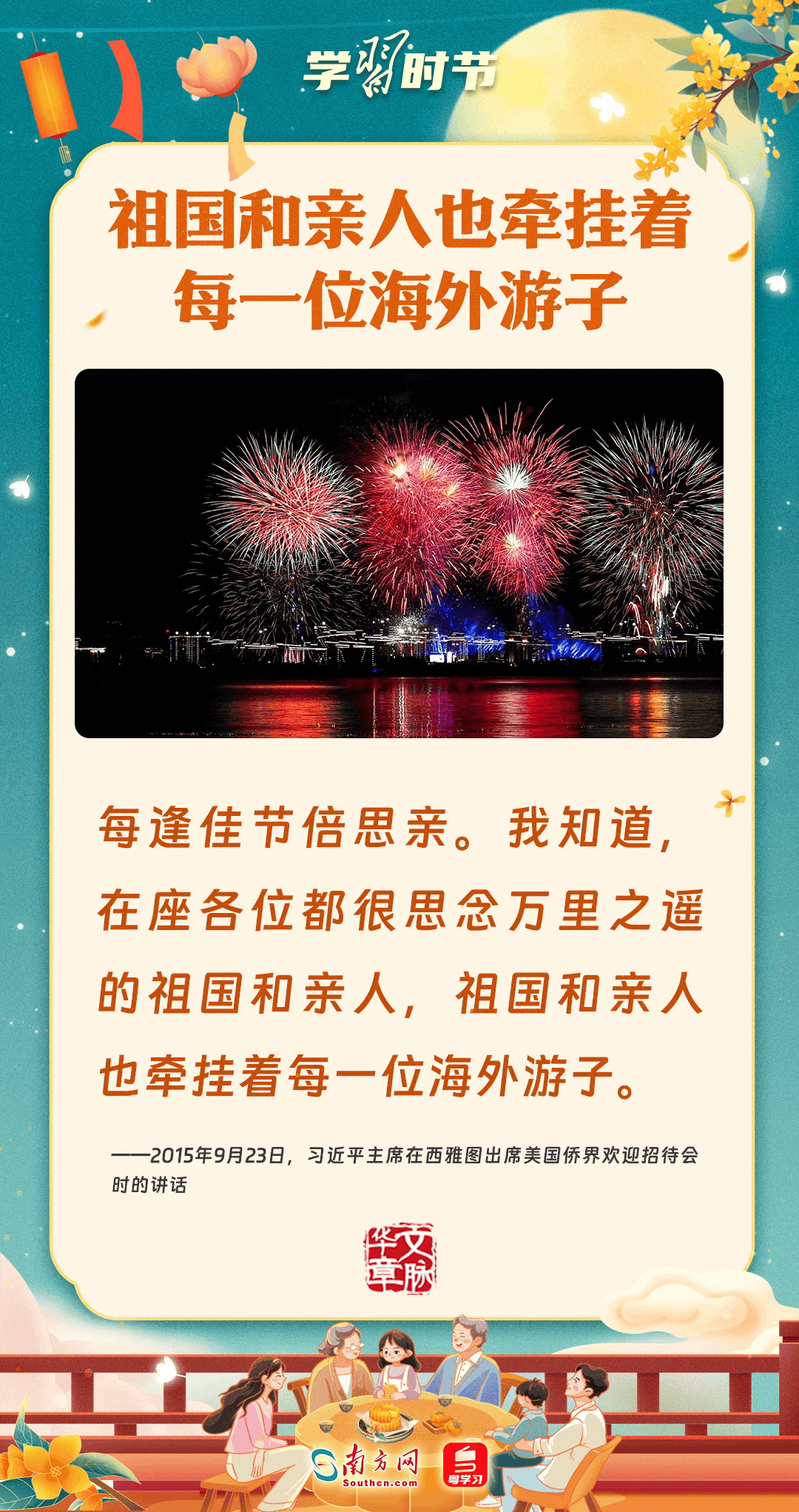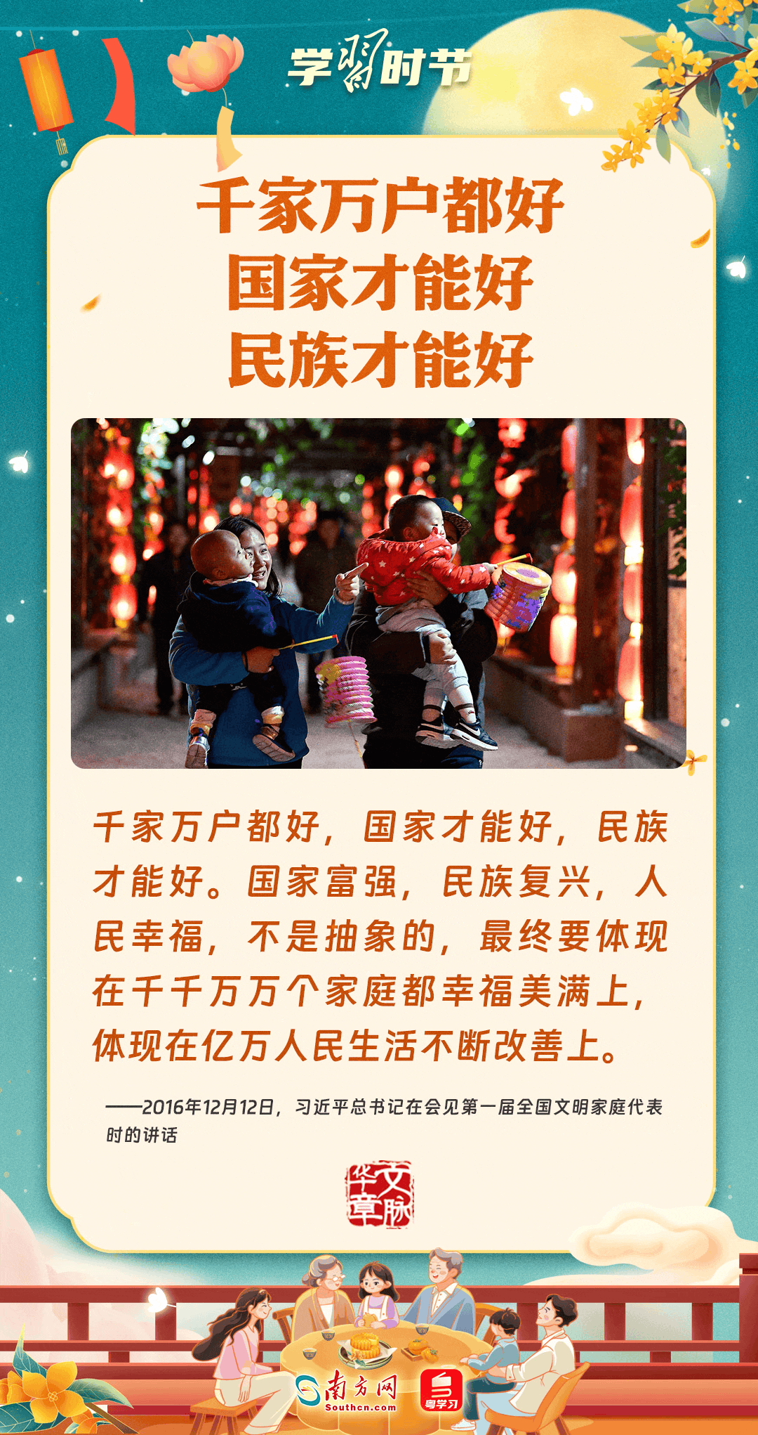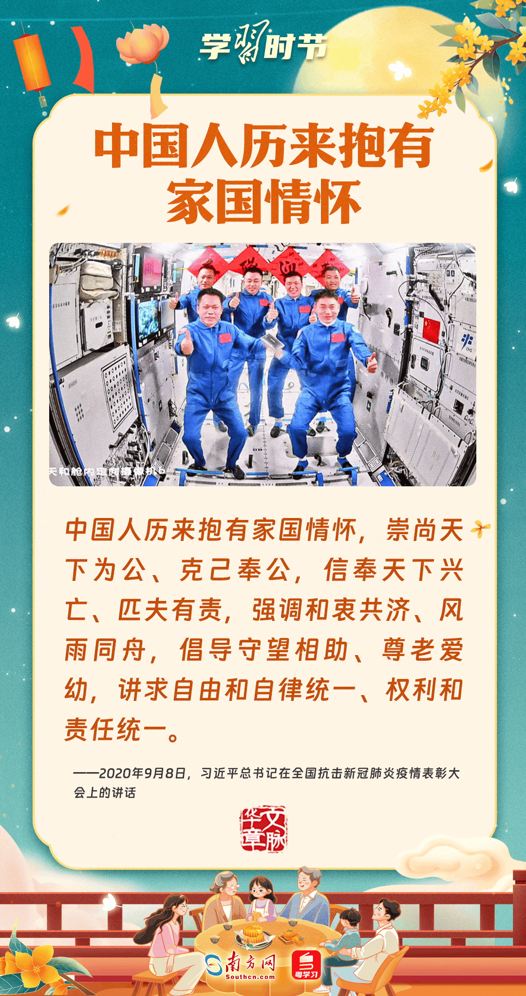 明月寄相思,家國總關情。作為中華優(yōu)秀傳統(tǒng)文化的重要載體之一,中秋節(jié)不但寄托著海內外華人對闔家團圓的美好期許,還承載著深厚的故鄉(xiāng)情、家國情。習近平總書記曾在多個場合深刻闡述個人、家庭與國家之間的關系,強調要厚植家國情懷,把實現(xiàn)個人夢、家庭夢融入國家夢、民族夢之中。中秋佳節(jié),讓我們一起回顧總書記那些經典話語,共同感受他至深至厚的家國情懷。