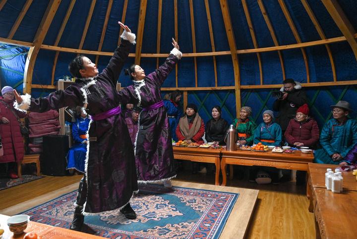 2023年12月21日,烏蘭牧騎隊員在內(nèi)蒙古阿其圖烏拉蘇木進行舞蹈表演。