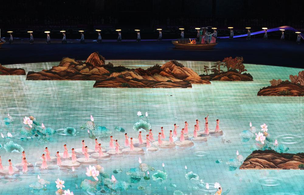 2023年9月23日,演員在杭州亞運會開幕式上表演?!肚Ю锝綀D》和《富春山居圖》兩幅國寶級名畫,通過數(shù)字技術(shù),成為移動的山水。
