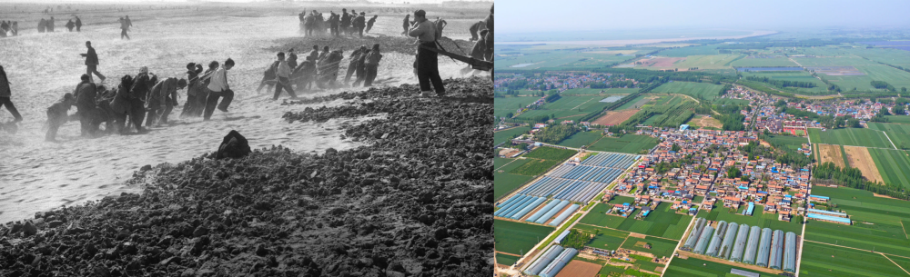 拼版照片:左圖為蘭考群眾在拉淤土壓沙(新華社記者 鄧歷耕 攝);右圖為2024年4月25日拍攝的蘭考縣張莊村(無(wú)人機(jī)照片,新華社記者 郝源 攝)。