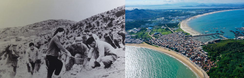 拼版照片:左圖為東山縣群眾在荒山上種植樹(shù)苗(資料照片);右圖為2020年6月18日拍攝的東山縣陳城鎮(zhèn)澳角村附近風(fēng)光(無(wú)人機(jī)照片,新華社記者 姜克紅 攝)。