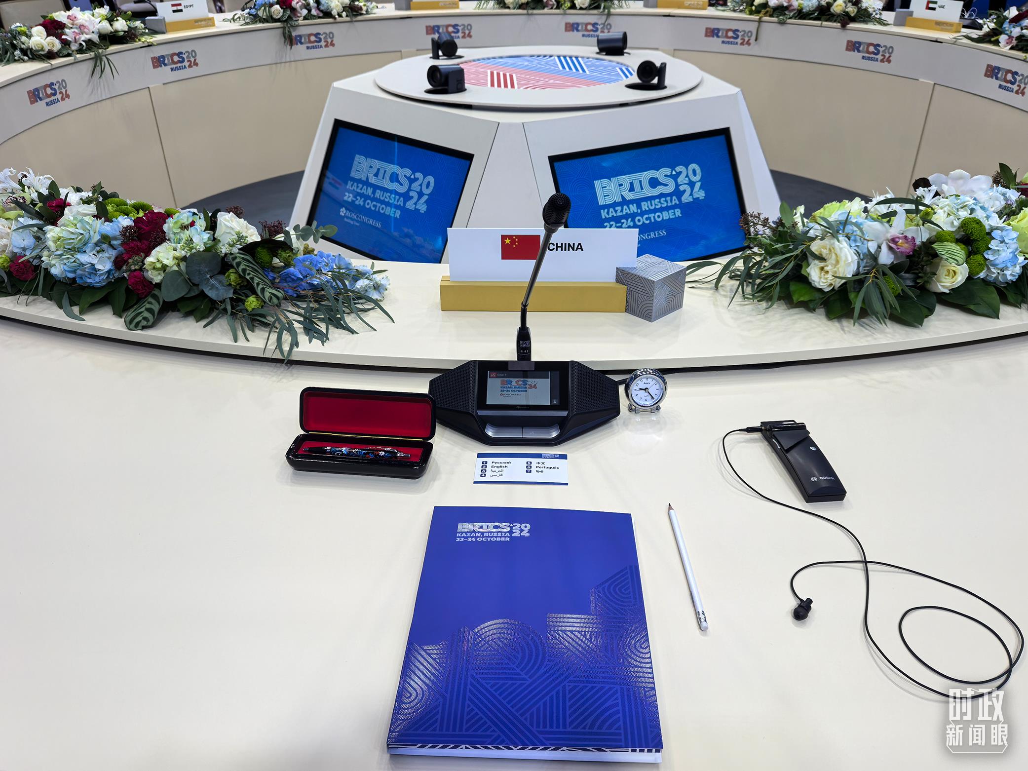 金磚國家領(lǐng)導人小范圍會議現(xiàn)場的會議桌。(總臺央視記者程鋮拍攝)