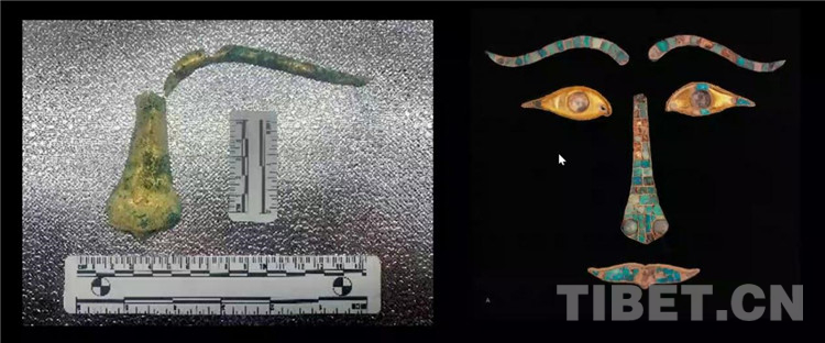 圖為西藏當(dāng)雄吐蕃墓地出土面具殘件與青海都蘭熱水墓群“2018血渭一號墓”出土面具
