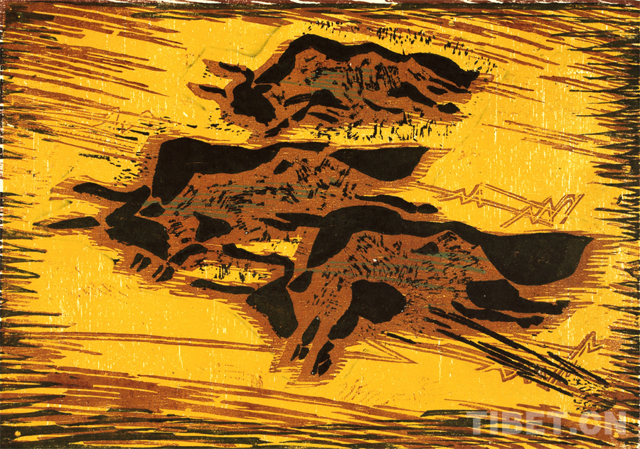 如果非要說我在版畫技法上有什么創(chuàng)新,參照西藏匠人刻經(jīng)文,在石頭上刻出來然后印出來也許就算。這不是一般石版畫概念,那叫石印,平版印刷;我這是凹版印刷??唐饋砗苜M勁,我也不管費不費勁。我有一批這樣的石刻作品。綜合版作品手法較多,我通常分別在石板和木板上刻,然后套起來印。如果搞學(xué)術(shù)交流,也許值得一談。至于說到創(chuàng)新,第一我不認(rèn)為我有什么創(chuàng)新,第二我不認(rèn)為在藝術(shù)上、在美術(shù)上能夠輕易談創(chuàng)新這個詞。還有第三個觀點:不需要創(chuàng)新。很簡單,你先把傳統(tǒng)學(xué)到手再說。既是傳統(tǒng),就有它的存在理由,否則早就夭折了,還傳什么統(tǒng)呢?傳,而且統(tǒng)??!統(tǒng)是什么意思?基調(diào)是它統(tǒng)一起來的。先把傳統(tǒng)學(xué)到手,爐火純青了,神來之筆出現(xiàn)了,才有可能有所創(chuàng)造。基礎(chǔ)是重要的。