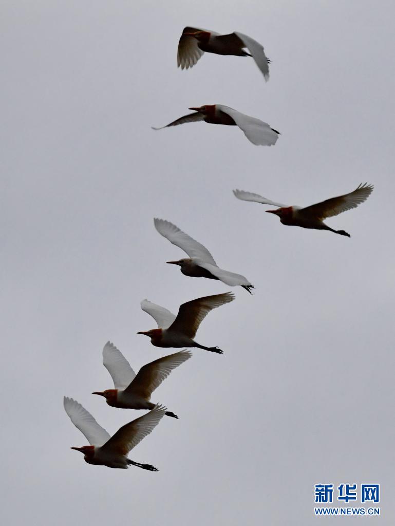 牛背鷺在易貢國(guó)家地質(zhì)公園上空飛翔(5月22日攝)。新華社記者 張汝鋒 攝