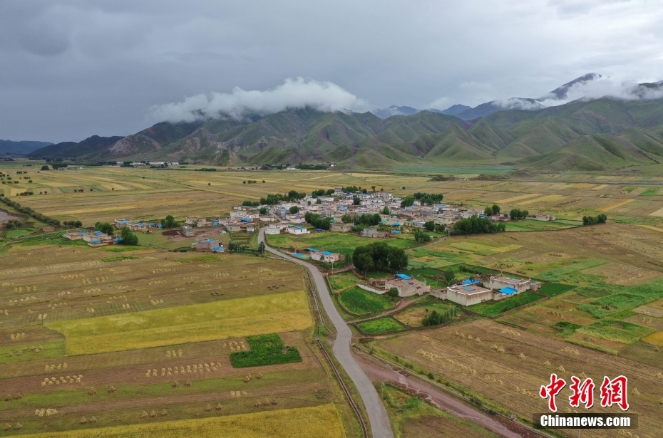 9月8日,西藏自治區(qū)拉薩市林周縣境內(nèi)的田野美景。金秋時節(jié),拉薩河谷一帶青稞成熟,呈現(xiàn)豐收美景。(無人機照片)中新社記者 貢嘎來松 攝