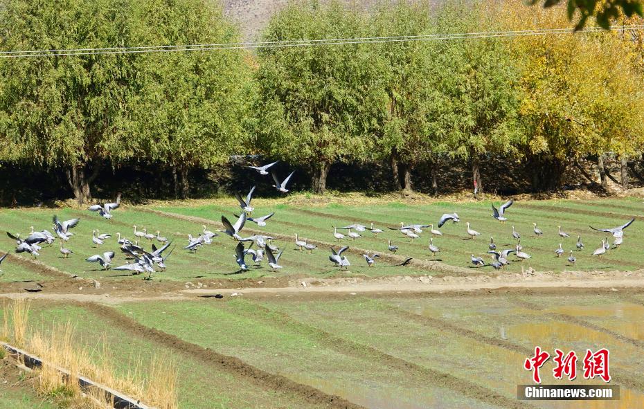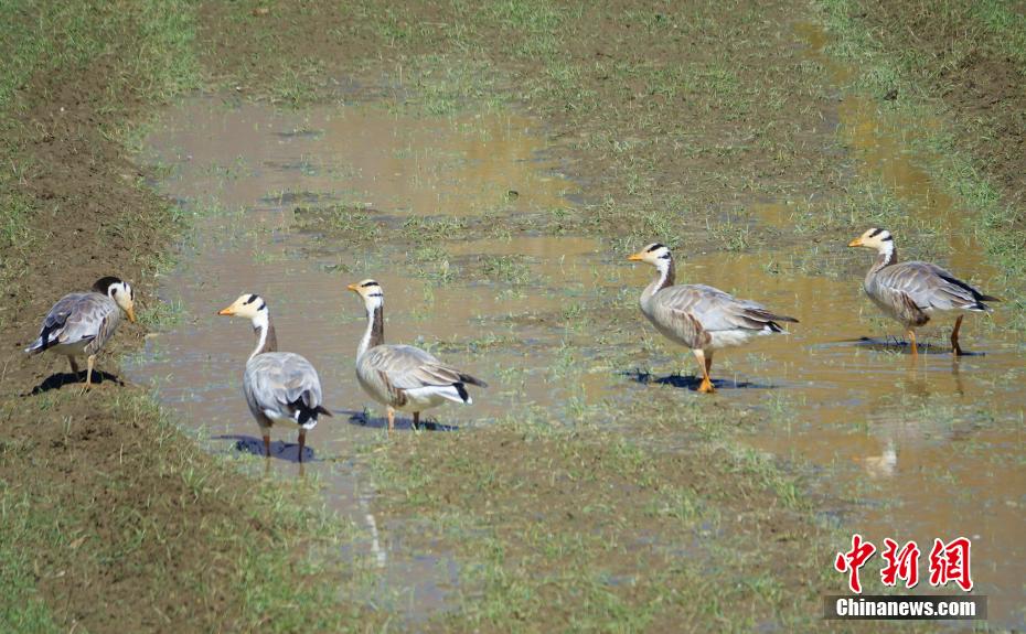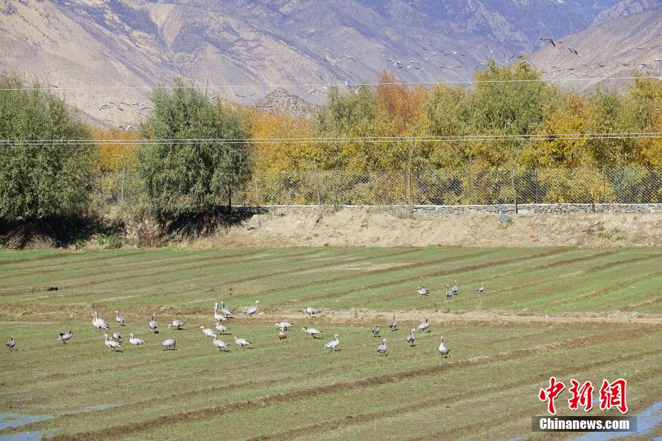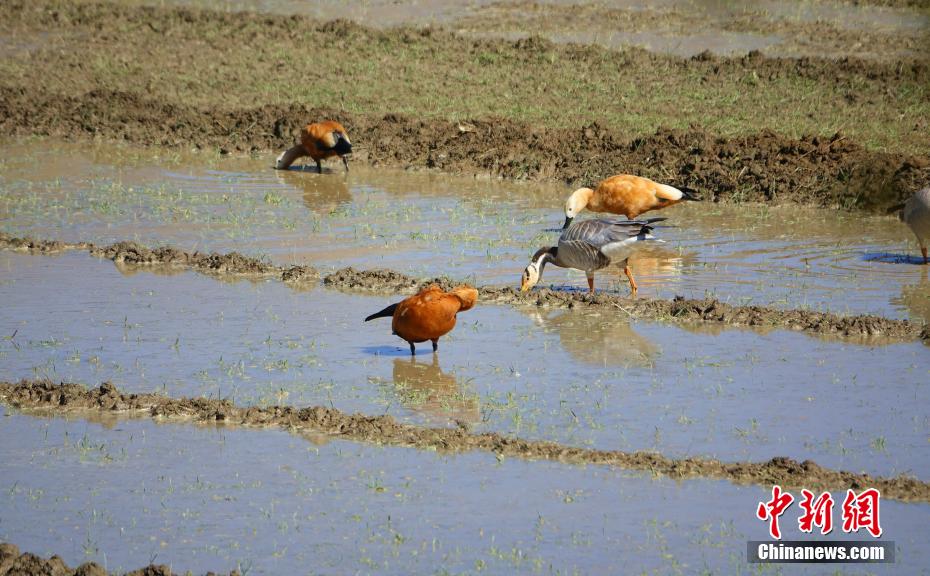 圖為11月12日,斑頭雁、赤麻鴨等鳥(niǎo)類在西藏山南市扎囊縣境內(nèi)的農(nóng)田內(nèi)。冉文娟 攝