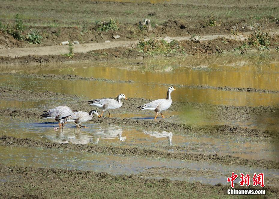 圖為11月12日,斑頭雁、赤麻鴨等鳥(niǎo)類在西藏山南市扎囊縣境內(nèi)的農(nóng)田內(nèi)漫步。冉文娟 攝