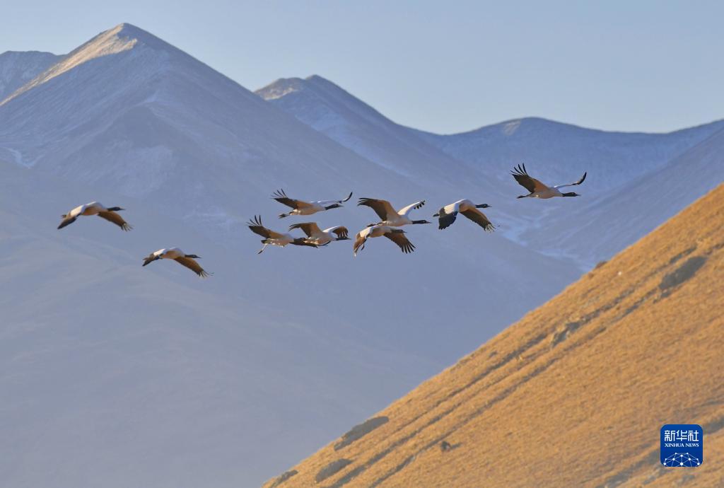 黑頸鶴在拉薩市林周縣黑頸鶴自然保護(hù)區(qū)飛翔(1月8日攝)。新華社記者 張汝鋒 攝