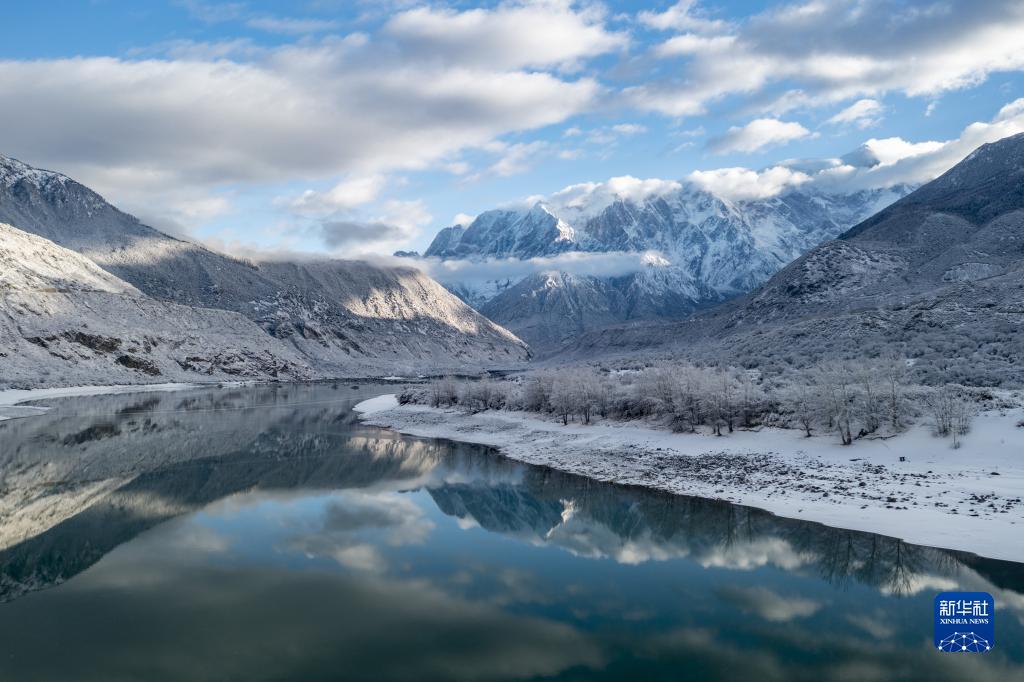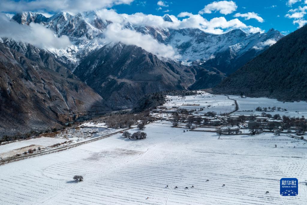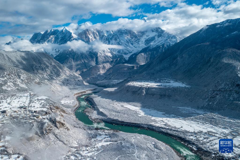 當(dāng)日,西藏林芝市米林縣派鎮(zhèn)雅魯藏布大峽谷附近普降瑞雪,銀裝素裹的雅魯藏布江和南迦巴瓦峰顯得格外壯美。