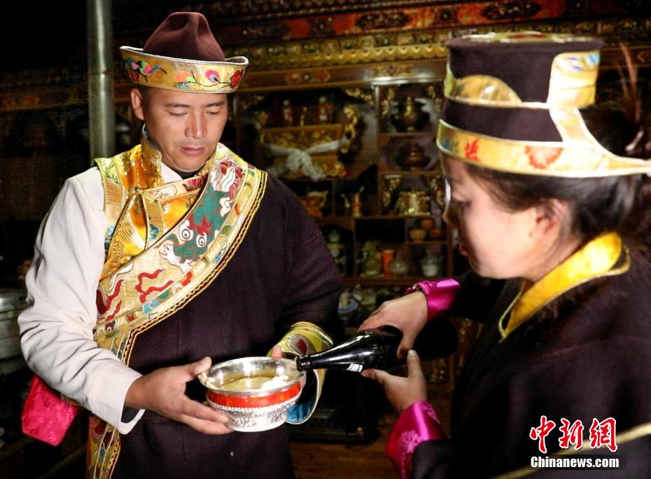 11月24日恰逢藏歷十月初一,西藏林芝迎來(lái)2023年工布新年,這是西藏最早的新年。工布新年以其悠久的歷史、鮮明的特色、豐富的內(nèi)涵,于2006年被列入第一批西藏自治區(qū)非物質(zhì)文化遺產(chǎn)保護(hù)名錄。圖為村民向客人敬酒。 阿仁 攝
