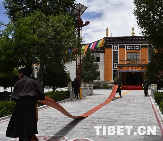 在位于拉薩市區(qū)的班禪行宮雪林多吉頗章大院內(nèi),一場(chǎng)更加熱烈的儀式也即將進(jìn)行。在雪林多吉頗章主殿前,僧人們提前繪制了金剛結(jié)等吉祥圖案,一條尺許寬的地毯從歡迎隊(duì)伍處一直延伸到主殿門前。來(lái)自拉薩各大寺廟的僧眾代表和拉薩信教群眾代表,帶著虔誠(chéng)和喜悅的心情,翹首以盼十一世班禪的到來(lái)。