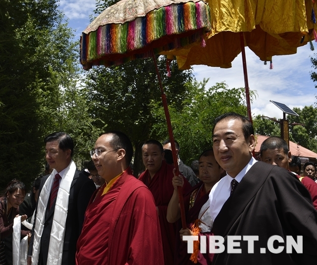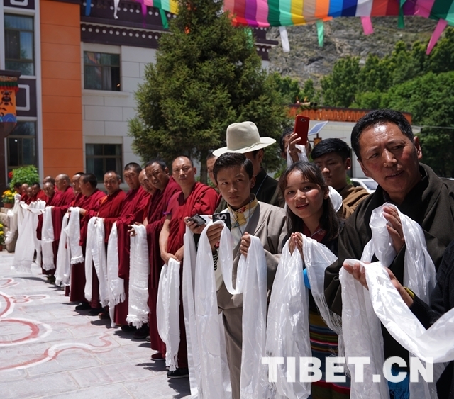 當(dāng)大院內(nèi)響起法號(hào)聲時(shí),早已在此等候的僧俗信教群眾紛紛翹首踮足,盼望一睹十一世班禪的風(fēng)采。十一世班禪剛下車,高僧們手持香爐,打著幡幛、華蓋,吹奏佛樂(lè),以藏傳佛教最隆重的禮儀迎接班禪額爾德尼?確吉杰布的到來(lái)。身著藏族傳統(tǒng)盛裝的男女青年,向十一世班禪敬獻(xiàn)象征吉祥如意的“切瑪”,表達(dá)拉薩各族各界人士和僧俗信教群眾的美好祝愿。在此等候的自治區(qū)有關(guān)領(lǐng)導(dǎo)也與十一世班禪互敬哈達(dá)、互致問(wèn)候。