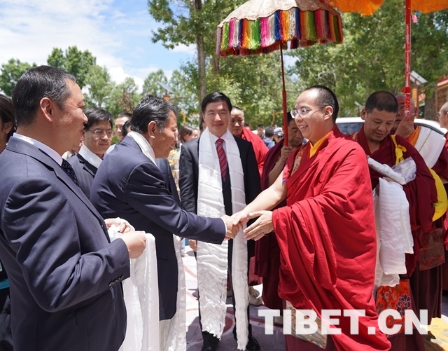 圖為西藏自治區(qū)有關(guān)領(lǐng)導(dǎo)與十一世班禪互敬哈達(dá)、互致問(wèn)候。攝影:王淑