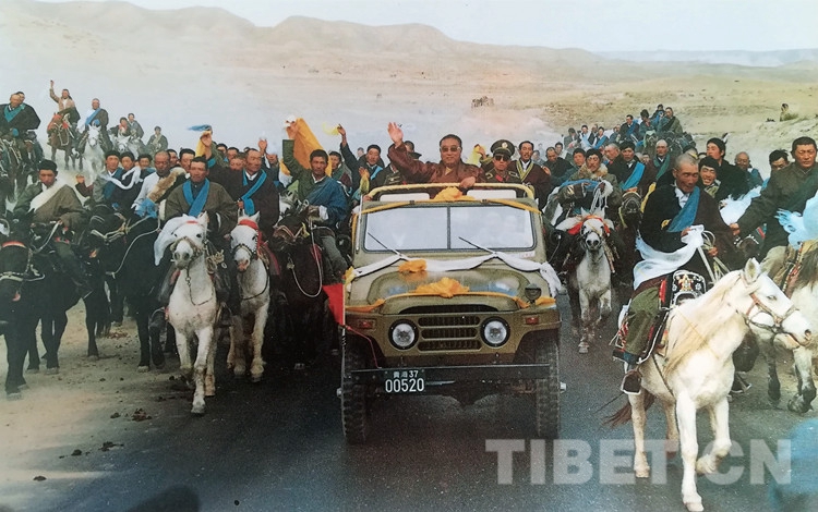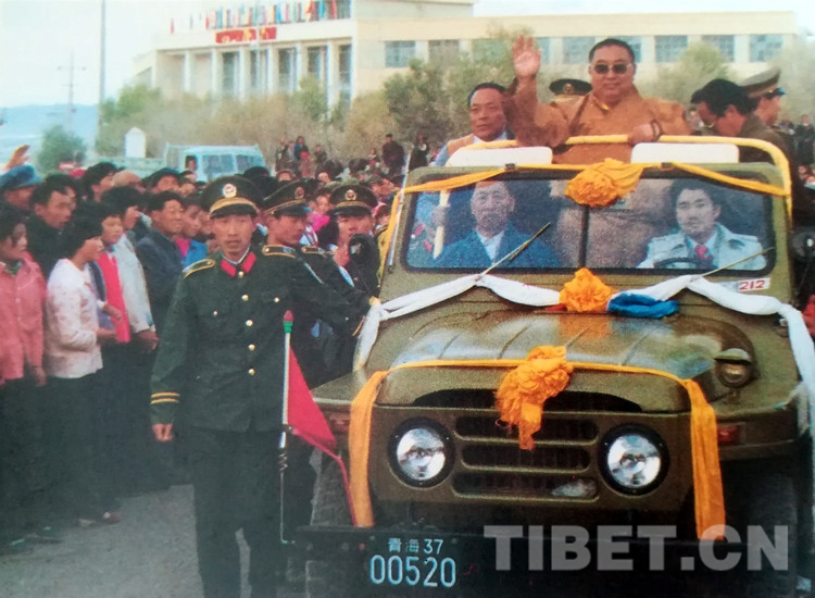 當(dāng)十世班禪大師在原青海省人大常委會(huì)副主任夏茸尕布、原海南州委書(shū)記東主加的陪同下,乘敞篷車(chē)從幸福灘來(lái)到海南州州府所在地恰卜恰鎮(zhèn)時(shí),各族人民群眾身著節(jié)日盛裝,載歌載舞,熱烈歡迎十世班禪大師。十世班禪神采奕奕,精神飽滿,高興地向各族群眾招手致意。