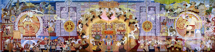 壁畫左面主體為手舉火把辭舊的西藏牧區(qū)婦女,她的四周環(huán)繞著吃古突、沐浴、背水、鳴槍、拋五谷、彈六弦、熱巴舞等活動場面,以及手捧果實(shí)的門巴族、珞巴族人物。