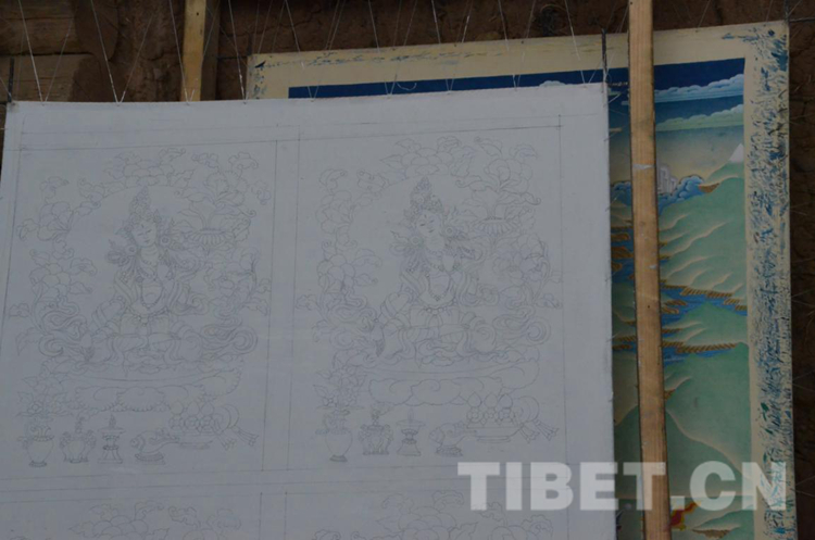 除了現(xiàn)場(chǎng)正在繪畫(huà)的3名學(xué)徒外,西熱秋久還有其他14名徒弟,他們大都是村里的建檔立卡戶(hù)。自2016年起,經(jīng)駐村工作隊(duì)和村“兩委”研討、建檔立卡戶(hù)同意后,最終扶持本村的致富帶頭人西熱秋久成立了唐卡繪制農(nóng)牧民專(zhuān)業(yè)合作社,定為村里的扶貧產(chǎn)業(yè),建檔立卡戶(hù)可以來(lái)此學(xué)習(xí),成為學(xué)徒后在這里學(xué)習(xí)唐卡繪制,吃住都在這里并能獲得一定的工資。