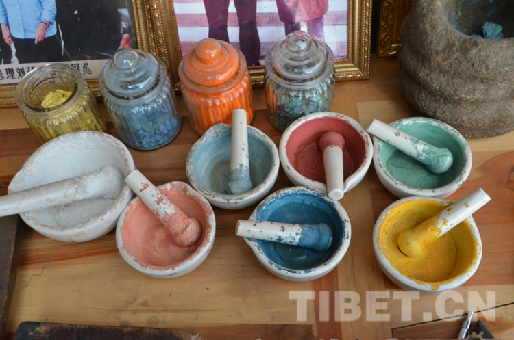 在門(mén)口的桌上,西熱秋久拿起一本泛黃的藏書(shū)籍向我們介紹,這是家中祖祖輩輩流傳下來(lái)的“繪畫(huà)標(biāo)準(zhǔn)”,里面記載了各類(lèi)造像的比例。在學(xué)習(xí)繪制唐卡時(shí),必須從造像的經(jīng)典比例入手,對(duì)人體結(jié)構(gòu)有所了解后,再開(kāi)始衣飾形象的臨摹訓(xùn)練,期間需要學(xué)習(xí)畫(huà)布、毛筆的制作,礦、植物顏料的研磨、泡制、使用等技巧。