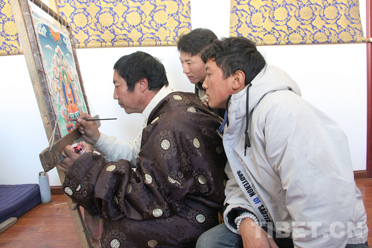 直到今天,父親雖然已經(jīng)離開(kāi)人世很多年了,曲扎依然堅(jiān)持子承父業(yè),手握畫(huà)筆,在偏遠(yuǎn)的山坳里為寺廟、信教群眾繪制唐卡、壁畫(huà)。曲扎的3個(gè)兒子桑昂然珠(18歲)、土丁格來(lái)(14歲)、桑丁特秋(9歲)都在家里跟隨他學(xué)習(xí)勉唐畫(huà)派技藝,在祖孫四代的不懈努力下,古老的勉唐畫(huà)派在類(lèi)烏齊縣境內(nèi)得以代代相傳。