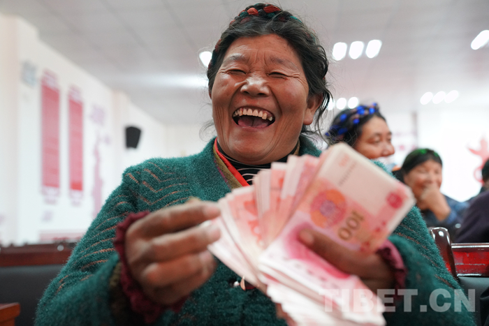 令人激動的時刻來臨了?!岸M索朗曲珍,分紅26739元;二組支張,分紅6495元;一組朗杰曲珍,分紅2668元……”社員們?nèi)讲⒆鲀刹剑瑵M臉喜滋滋地依次上臺接過沉甸甸的分紅。他們在分紅發(fā)放清單上填上名字,摁上手印后,喜笑顏開地數(shù)著手里的錢。