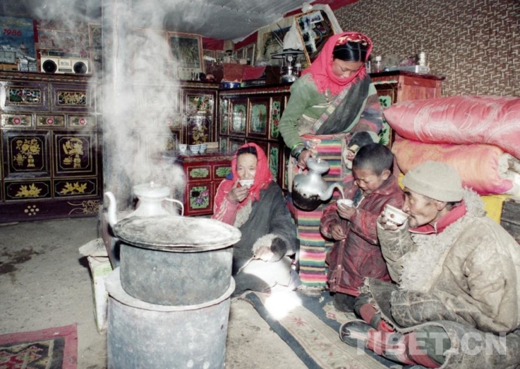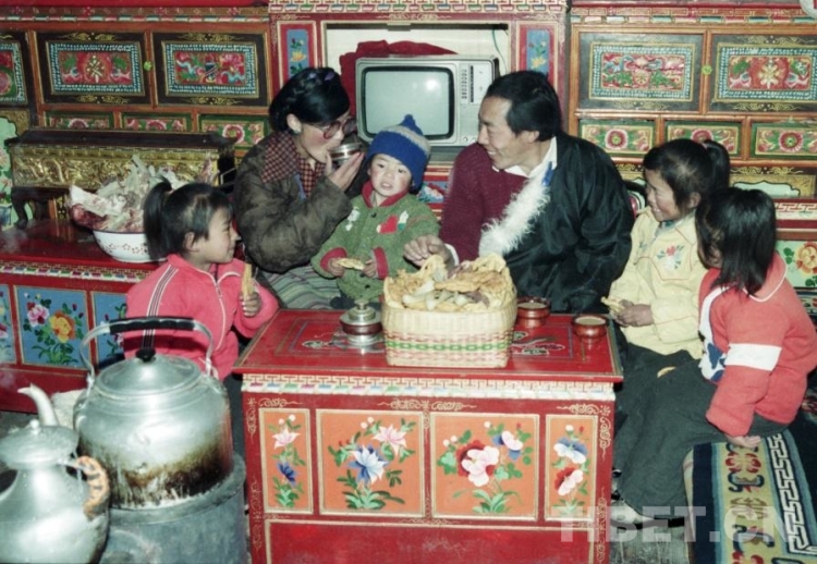 圖為藏北那曲鎮(zhèn)托美朗加一家人在喝酥油茶、吃油炸果,其樂(lè)融融 唐召明1989年攝