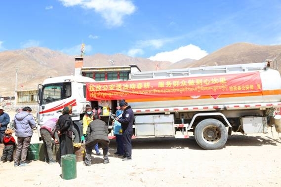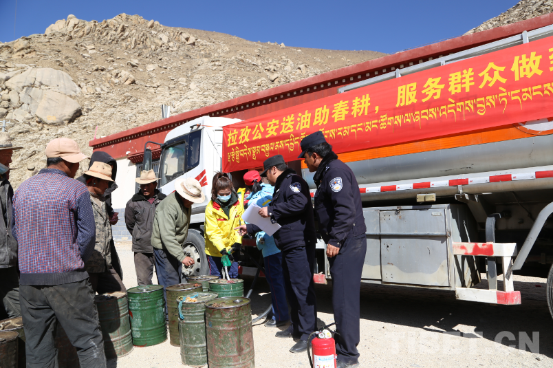 因拉孜縣彭措林鄉(xiāng)、扎西崗鄉(xiāng)地處偏遠(yuǎn),村民購買柴油困難,拉孜縣公安局及時(shí)與相關(guān)部門和中國石油拉孜分公司溝通協(xié)調(diào),適時(shí)掌握群眾用油需求,成立了拉孜公安送油小分隊(duì),指派專職民警跟著油車送油助春耕,將便民、惠農(nóng)服務(wù)延伸到田間地頭,讓群眾不出村就可以加到放心的柴油。