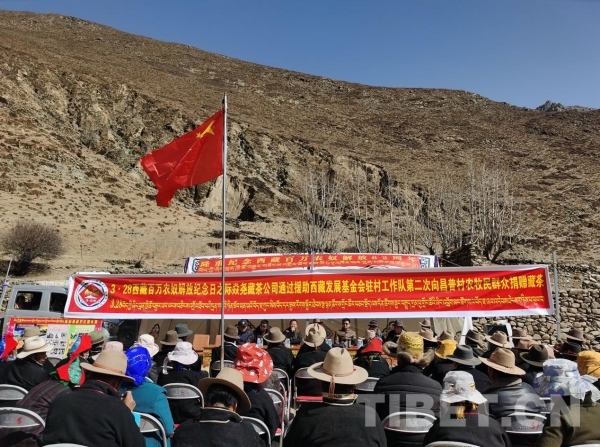 援助西藏發(fā)展基金會駐多角鄉(xiāng)昌普村工作隊與雅安相關藏茶公司向昌木普村每位村民獻上哈達并捐贈60份優(yōu)質藏茶,表達對全體村民深情祝福。