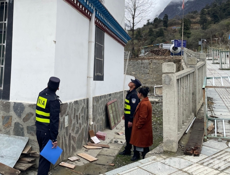 圖為西藏山南邊境管理支隊浪坡邊境派出所民警對邊民群眾住宅進(jìn)行震后排查