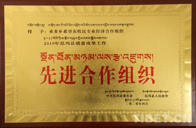 圖為尼瑪縣委、政府頒發(fā)的先進(jìn)合作組織獎牌