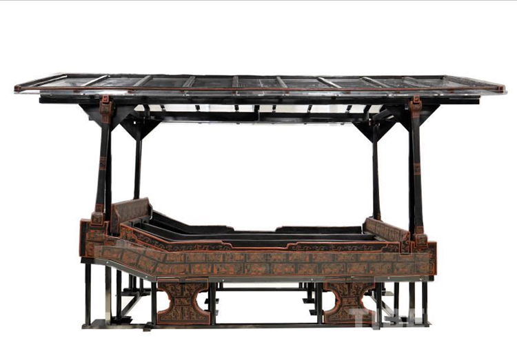 2000年,在成都商業(yè)街船棺墓葬群出土了迄今為止體量最大的船棺以及數(shù)百件精美的漆器,為古蜀文明研究提供了極其重要的實(shí)物資料。其中這件斷代約為春秋晚期到戰(zhàn)國(guó)早期、據(jù)專家推測(cè)可能來(lái)自古蜀王國(guó)的“豪華”漆床令人嘆為觀止。漆床長(zhǎng)2.55米、高約1.8米、寬1.3米,由45個(gè)構(gòu)件組合而成,構(gòu)件中最長(zhǎng)的床頂正脊長(zhǎng)達(dá)3.27米,最小的只有26.5厘米,床頂應(yīng)該還搭有織物床幔。是中國(guó)目前年代最早、體量最大、結(jié)構(gòu)最為復(fù)雜、保存最完整的漆床。漆床四側(cè)床板通體黑漆,板上朱、赭二色繪制的回首狀龍紋,朱色單線勾勒的蟠螭紋華貴精美,彰顯著墓主人的尊貴身份。出土?xí)r,漆床部分構(gòu)件被盜擾,飽水糟朽,結(jié)構(gòu)脆弱。經(jīng)過(guò)清洗消毒、加固脫水、干燥定形等技術(shù)處理,它極致奢華的風(fēng)采得以面世。