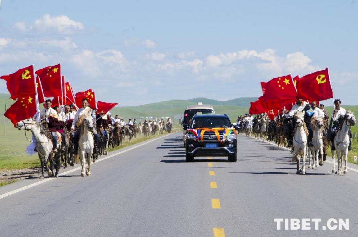 圖為調(diào)研結束時,牧民騎馬為班禪送行 攝影:歐帆