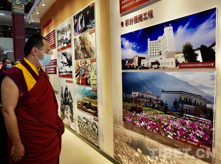 《十七條協(xié)議》簽訂、西藏自治區(qū)第一次人民代表大會(huì)召開、習(xí)近平總書記來信、對口援藏資金圖表……一幅幅圖片、一份份史料將西藏和平解放70年來,西藏從黑暗走向光明、從落后走向進(jìn)步、從貧窮走向富裕、從專制走向民主、從封閉走向開放的歷史生動(dòng)地呈現(xiàn)出來。班禪不時(shí)駐足觀看,詳細(xì)詢問有關(guān)情況,對西藏近年來各項(xiàng)事業(yè)取得的成就予以充分肯定。