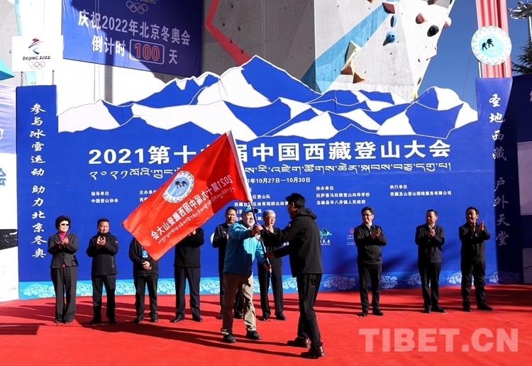 圖為國家體育總局登山運(yùn)動管理中心副主任、中國登山協(xié)會副主席、中國登山隊(duì)隊(duì)長王勇峰為2021第十九屆中國西藏登山大會授旗 攝影:賈華加