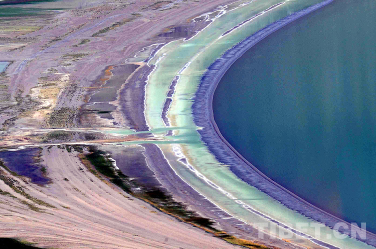 圖為班戈縣被賦予美麗傳說的硼砂湖。它的周圍有9道寬寬的環(huán)湖圈,有綠色的,有棕色的,五彩斑斕,清晰可見(唐召明2001年攝)