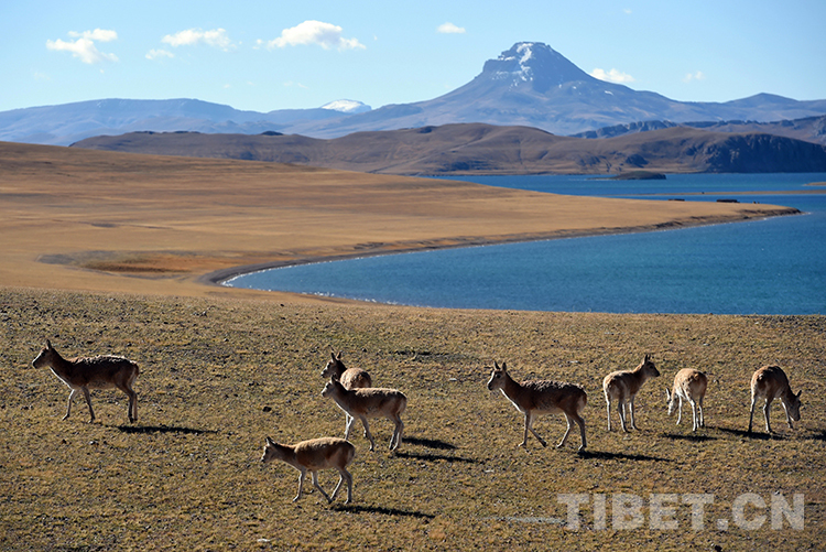 湖濱河畔,地勢平坦開闊,水草豐盛甜美,是藏羚羊頻繁活動的場所。藏羚羊是一種善跑的動物,跑起來輕快灑脫、疾如長風(fēng),時速可達(dá)80公里。