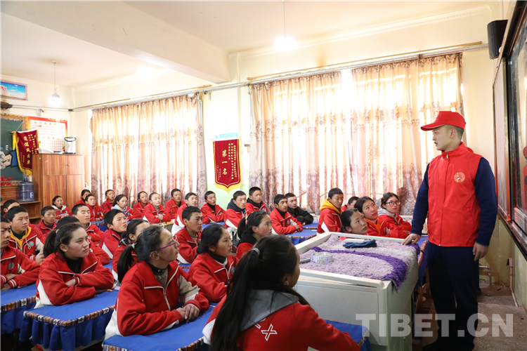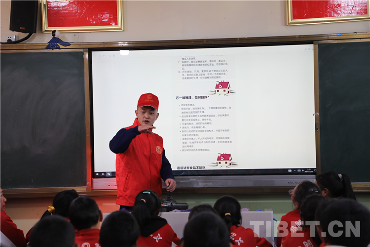 圖為那曲市森林消防大隊志愿者來到駐地附屬中學為師生們講解地震自救相關(guān)常識