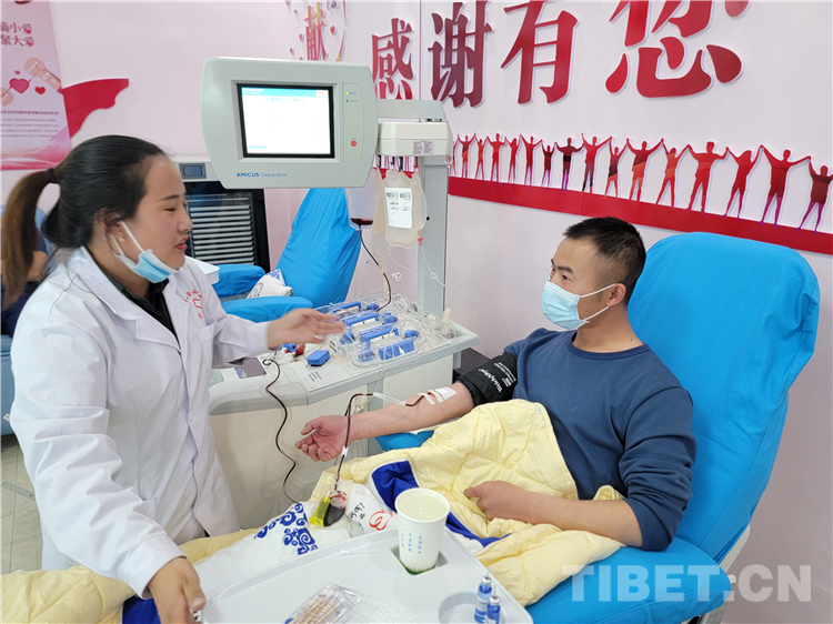 圖為那曲市森林消防大隊消防員張玉熙(右一)為那曲市人民醫(yī)院一名病人捐獻急需的B型血血小板