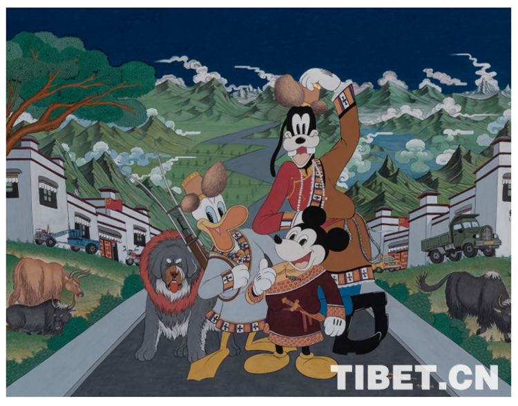唐卡藝術(shù)家邊巴的新唐卡《逛新城》,同樣的青山綠水,同樣的社會主義新農(nóng)村,不同的是,他讓米老鼠和唐老鴨穿上藏裝來做客了。隨著拉薩近年來的城市巨變,知名企業(yè)、品牌進(jìn)駐城市,也以獨(dú)特的風(fēng)格資源和自身亮點(diǎn)成為旅游勝地,一個(gè)嶄新而充滿活力的現(xiàn)代化拉薩正在崛起。作品在傳統(tǒng)與現(xiàn)代之間所傳遞的沖撞與融合,展現(xiàn)的自信與從容,正是中華文化的主流價(jià)值所在。