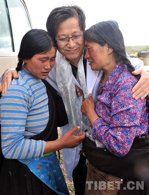 這是曾為斯求卓瑪進行手術(shù)的北京口腔醫(yī)院口腔頜面外科主任韓正學(xué)來到西藏自治區(qū)那曲市班戈縣新吉鄉(xiāng),在為斯求卓瑪作術(shù)后檢查時,卓瑪母女倆奔向韓正學(xué)懷抱相擁而泣(唐召明2015年7月14日攝)