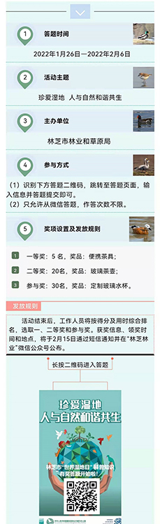 記者從“林芝林業(yè)”微信公眾號獲悉,為廣泛宣傳普及濕地保護知識,提升公眾濕地保護意識,進一步激發(fā)廣大群眾參與濕地保護和生態(tài)文明建設的熱情,西藏自治區(qū)林芝市特意在第26個“世界濕地日”來臨前開展了“世界濕地日”有獎答題活動!