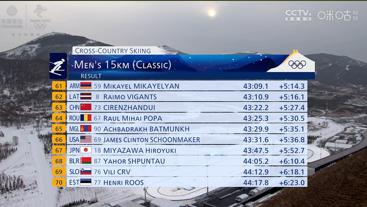 據(jù)悉,本場(chǎng)比賽共有99名運(yùn)動(dòng)員參加,每間隔30秒出發(fā)一人,運(yùn)動(dòng)員需在全長(zhǎng)7.5公里的越野滑雪賽道上完成兩圈比賽。次仁占堆以第73名的序位出發(fā),與次仁占堆一起參賽的中國(guó)選手還有尚金財(cái)、哈得斯·巴德里汗、劉榮勝。最終尚金財(cái)排名第41位,劉榮勝排名第47位,哈得斯·巴德里汗排名第57位,次仁占堆排名第63位。