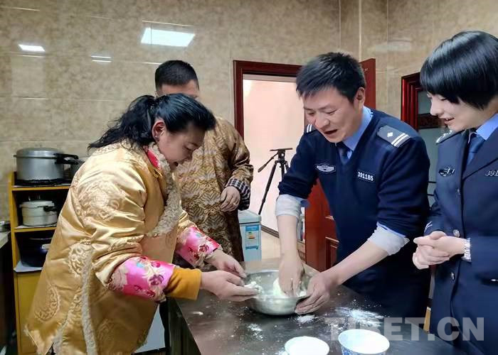 廚房里香味四溢,叔叔阿姨正在熬制古突(一種用牦牛肉湯熬煮的面食),民警們和面、搓面疙瘩,大家有說有笑分享著過藏歷新年的喜悅。“你們過年也要堅守崗位,今天咱們就一起吃‘古突’開開心心過個年。一會咱們還要在面疙瘩里包辣椒、毛線、羊毛、硬幣等9樣?xùn)|西。吃到這些東西的人要即時吐出。”民警們聽到白瑪阿姨講的這些感到十分有趣。