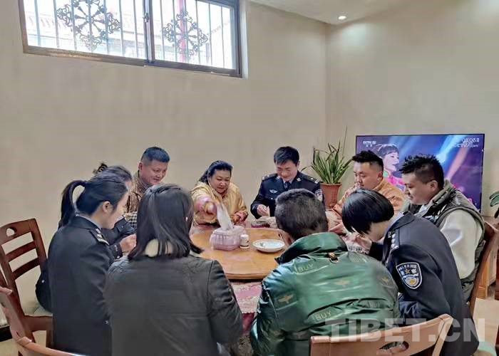 在藏歷水虎年到來之際,拉薩出入境邊防檢查站3名民警利用勤務(wù)間隙,帶著精心準(zhǔn)備的節(jié)日慰問品前往結(jié)親民警尼瑪拉姆家中拜年。熱情好客的尼瑪拉姆一家用特色風(fēng)干肉、煮牛肉、卡塞、時鮮水果等美食款待了前來結(jié)親的民警們。