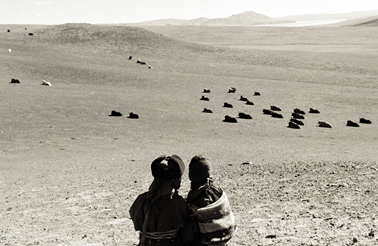 這是雙湖辦事處(現(xiàn)雙湖縣)嘎措鄉(xiāng)二村的兩名兒童正在觀看放牧的牦牛群(唐召明1988年攝)