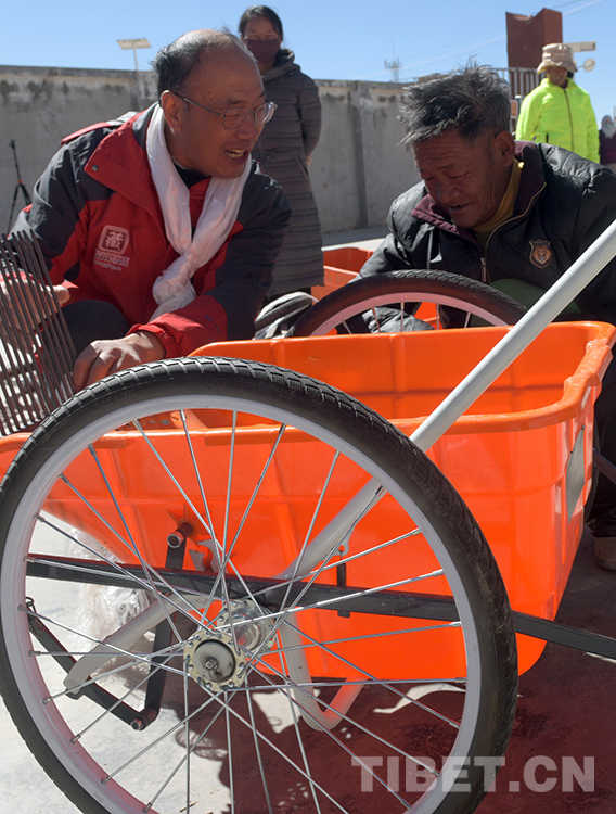 這是唐召明(左)在雙湖縣嘎措鄉(xiāng)一村指導(dǎo)他30多年前的房東、藏族牧民朋友日瑪(右)安裝北京建藏援藏工作者協(xié)會贈送的高原撿拾車(楊月云2019年9月20日攝)