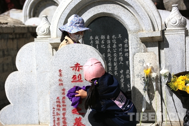 拉薩市烈士陵園內(nèi),一座座墓碑整齊排列,訴說著一個(gè)個(gè)不同歷史時(shí)期的英雄壯歌。兩個(gè)小女孩靈動(dòng)的身影在其間來回穿梭,不停地拿手中的抹布擦拭墓碑,還時(shí)不時(shí)向身旁的母親詢問著英雄的故事。