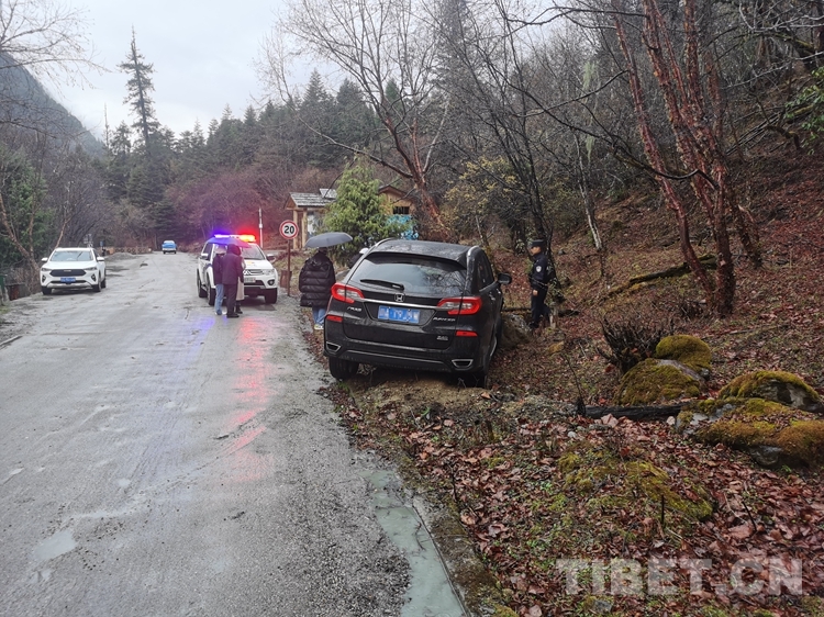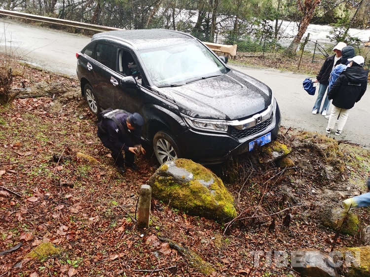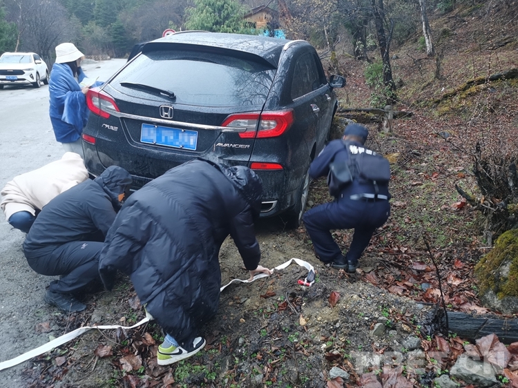 “我們是第一次遇到這種情況,不知道怎么辦,只有請求你們幫助!”當?shù)亟诮涤贻^多、道路濕滑,兩名廣東籍女游客在南伊風景區(qū)內游玩返回途中操作不慎,導致車輛發(fā)生側滑,撞在路邊石頭上,無法自行脫困。不熟悉當?shù)厍闆r的游客,在雨中焦急無助,撥打報警求助。