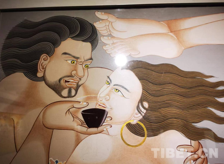 圖為鎮(zhèn)魔圖。作品以西藏“鎮(zhèn)魔圖”傳說為繪畫基礎(chǔ)進(jìn)行了探索性創(chuàng)作,色彩厚重絢麗 攝影:王淑