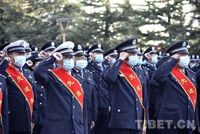 圖為2022年1月10日上午,西藏自治區(qū)公安廳組織民警迎接第二個中國人民警察節(jié)?,F(xiàn)場,全體民警舉右拳進行人民警察誓詞宣誓